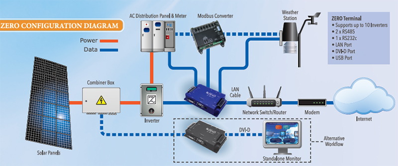 Solar Link ZERO Terminal can measure inverter output, revenue & consumption meters, weather stations, and other devices via 2 RS-485 and 1 RS-232c ports. With a simple internet connection, the collected data is uploaded to a cloud server where users can remotely monitor their PV system. Through a single ZERO Terminal, users can monitor 10 inverters simultaneously. Multiple ZERO Terminals can be connected to a single internet connection, making it easy to monitor large solar plants with minimal configuration required. For sites without an Internet connection or for sites desiring public kiosks, ZERO Terminal also comes equipped with DVI-D video output and customizable presentation software.